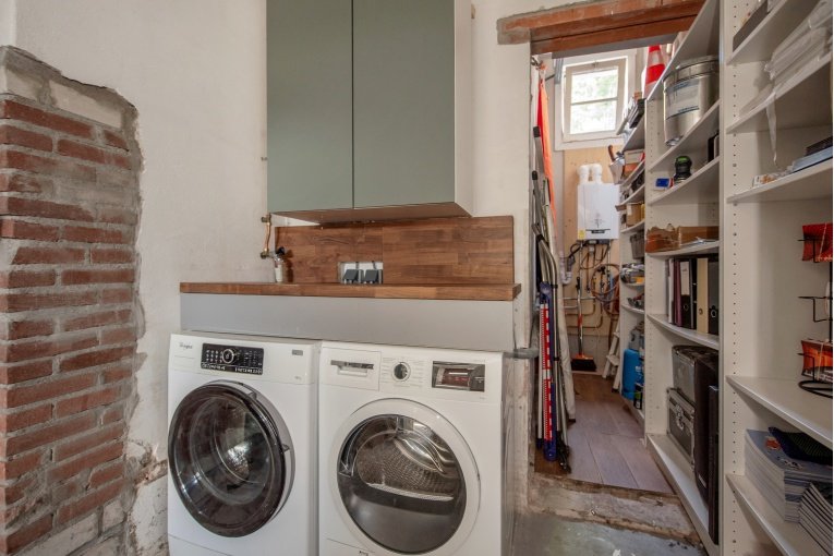 Binnenplaats. Apart modern vrijdragend toilet met fontein. Pantryblok.