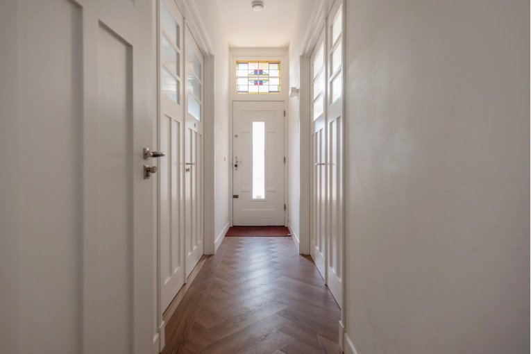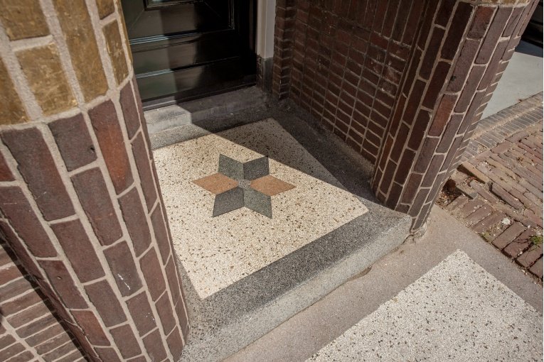 Voordeur op straatniveau met ster in de terrazzo granito-stoep, hetgeen verwijst naar de sinds de bouw van het pand gevestigde onderneming, De Drie Ster.
