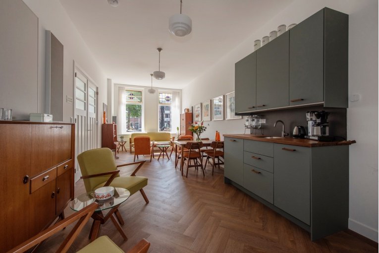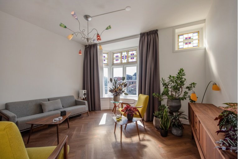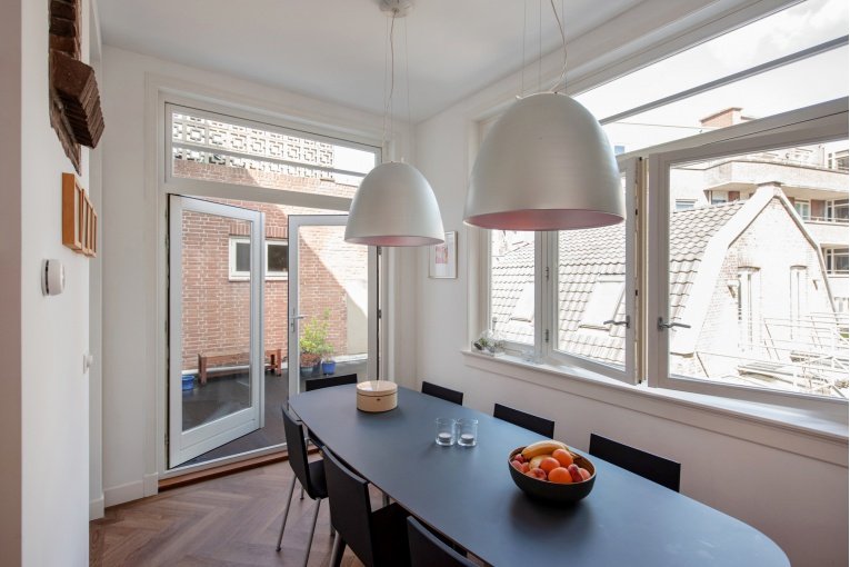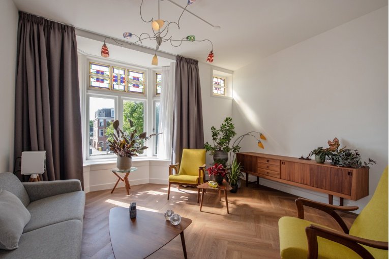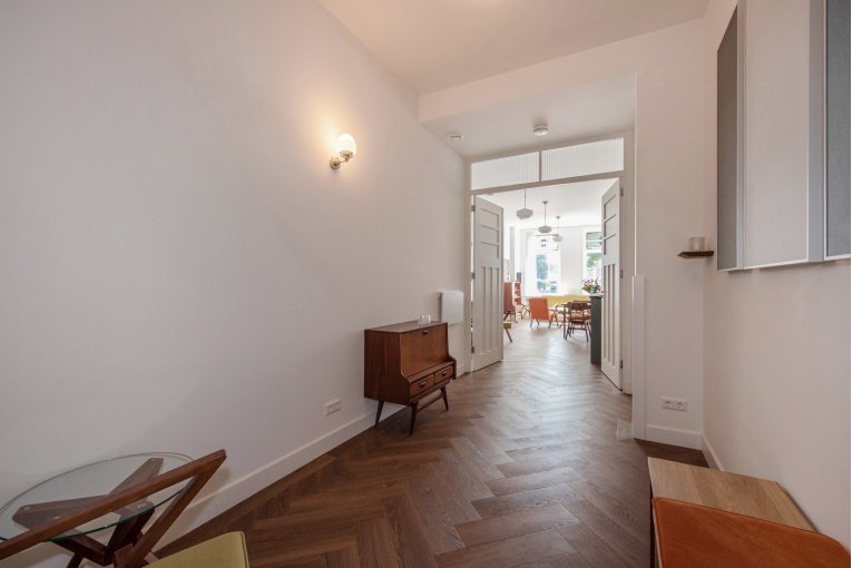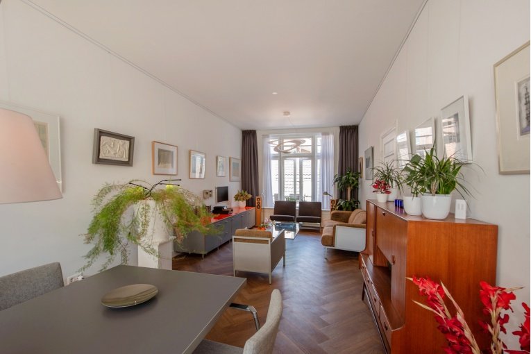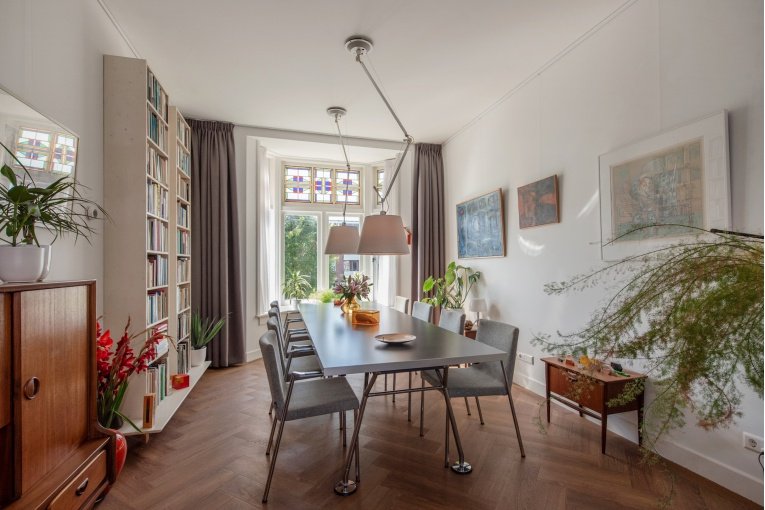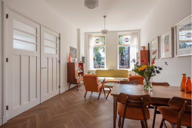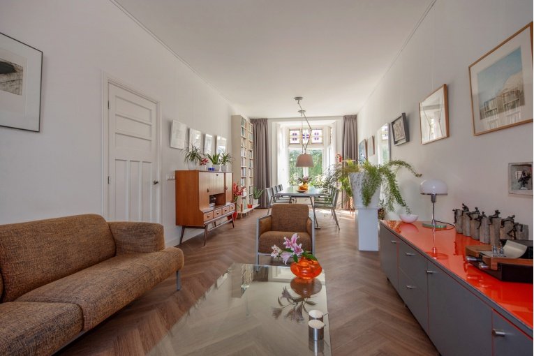 Fraaie trap naar de eerste verdieping; overloop. Tweetal woonkamers met elk fraaie Engelse Bay-windows (erkers) die leuke doorkijk geven over de Vliet. Aan de achterzijde treft u de moderne en goed ingedeelde L-vormige woonkeuken aan.