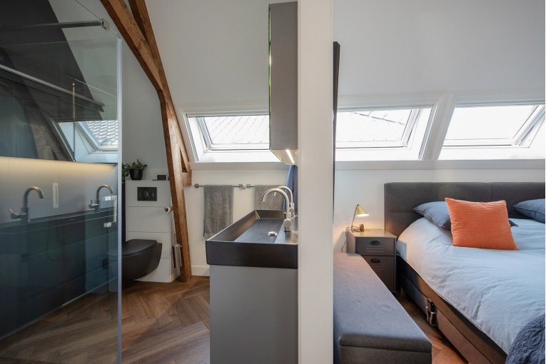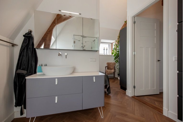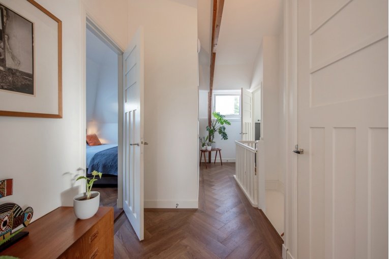 Apart vrijdragend toilet met fontein via overloop. Dan trap naar de tweede verdieping. Ruime overloop met daglicht. Voorheen 1 gigantische ruimte met ook veel hoogte. Geheel opnieuw en slim ingedeeld. Zo zijn er 4 slaapkamers, veel bergruimte en een tweetal moderne badkamers, elk met eigen toilet.