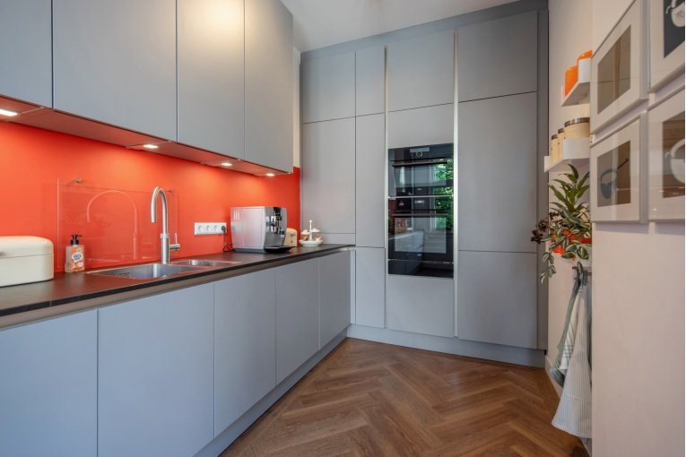 Met aan de lange wand voldoende lades en lang werkblad. Een 5-zone inductie kookplaat, wasemkap, vaatwasmachine, combioven, magnetron, oven, warmhoudlade, koelkast, separate vriezer, etc. Alles van AEG. Verder een Quooker met Cube, warm en koud water met of zonder bubbels.