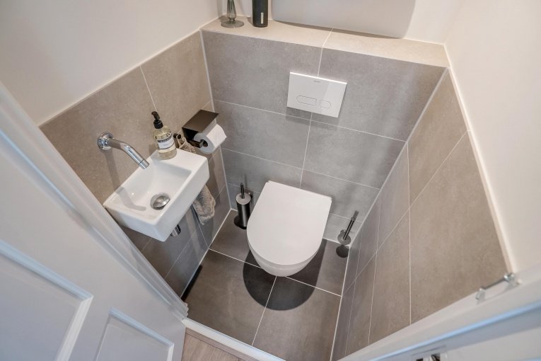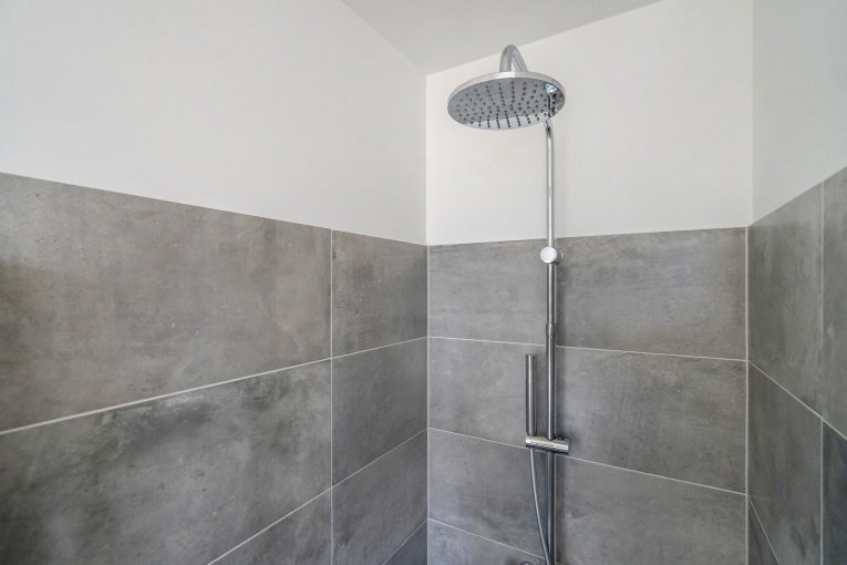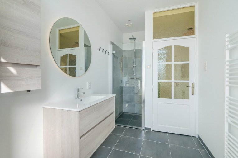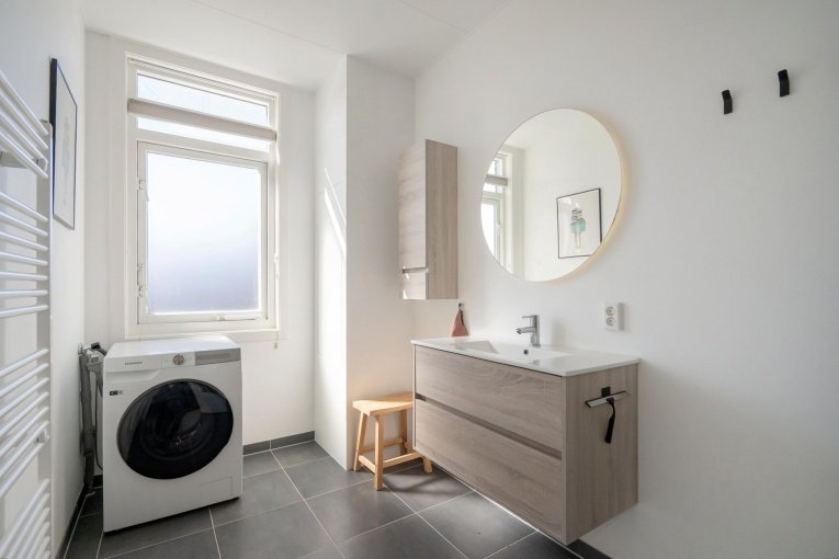 De woning beschikt over een modern, separaat toilet en een stijlvolle moderne badkamer voorzien van een inloopdouche met glazen deur, een wastafelmeubel, aansluiting voor de wasmachine en een raam met melkglas voor natuurlijk licht en privacy.