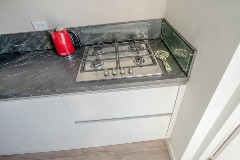De moderne, greeploze keuken is compleet uitgerust met diverse inbouwapparatuur, waaronder een 4-pits gasfornuis, vaatwasser, koelkast en oven. Vanuit de keuken heeft u toegang tot het balkon – een heerlijke plek om even buiten te zitten.