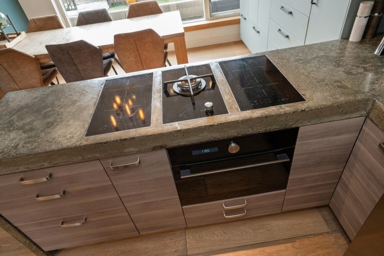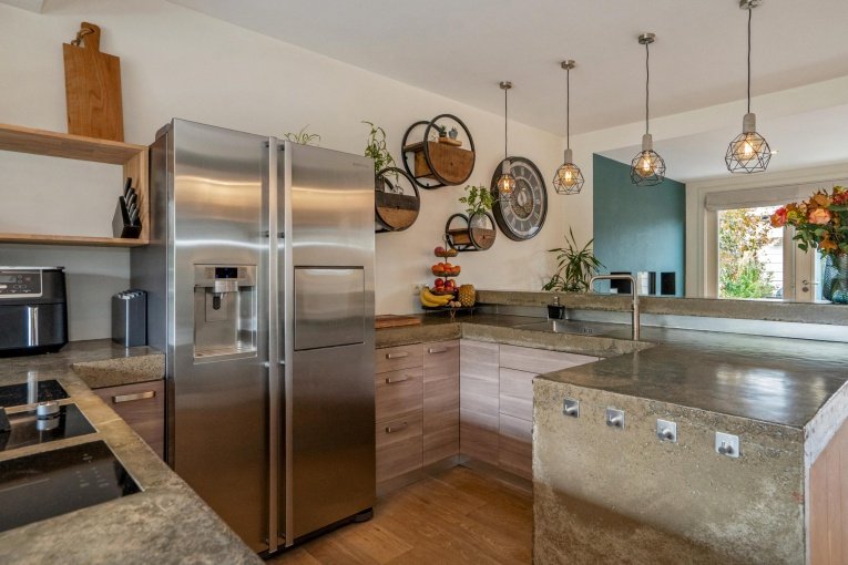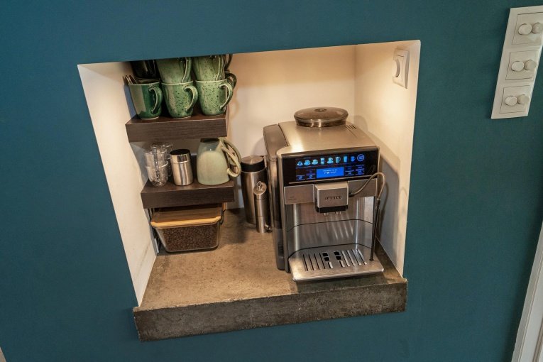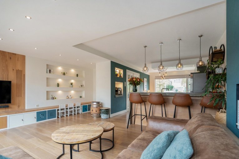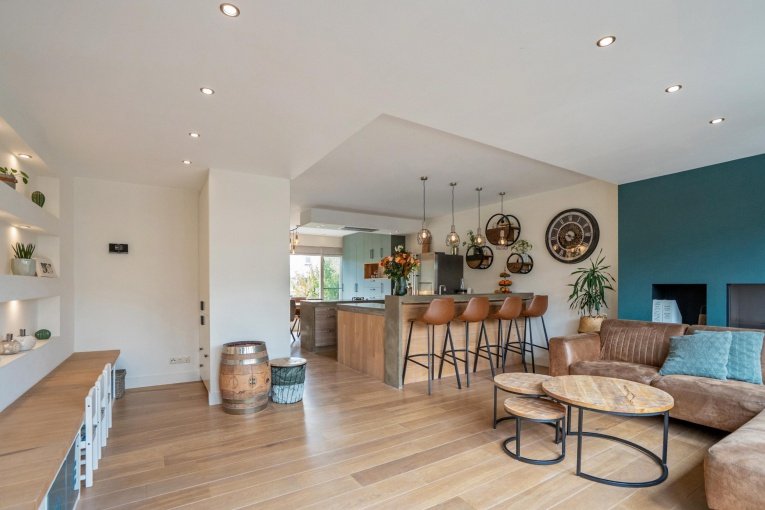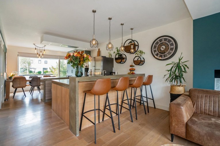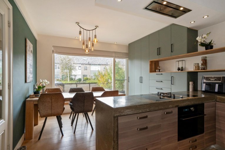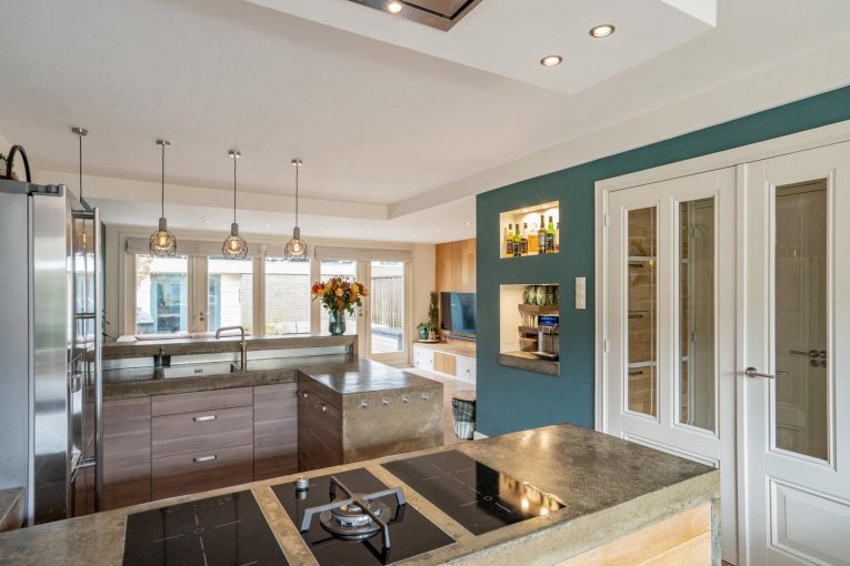 Ruime woonkeuken met in het midden van de woning de in U-vorm opgestelde moderne keuken welke is voorzien van diverse inbouwapparatuur (inductie kookplaat, afzuigkap, combi-oven/magnetron, vaatwasser en Quooker) en een eigen koffiecorner.
