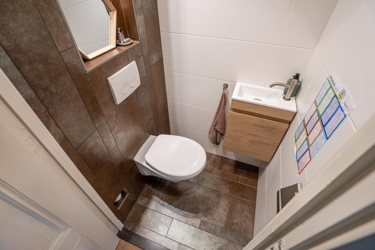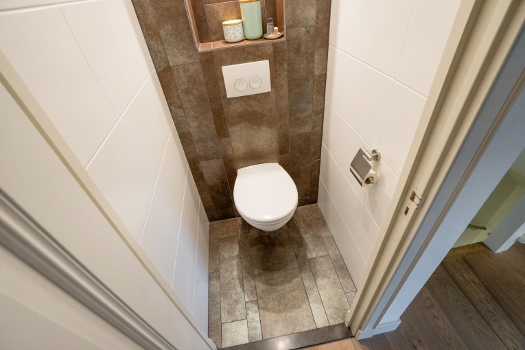 Voortuin. Entree woning via de ruime hal met meterkast. Ruime bergkast en modern vrijdragend toilet met fontein.