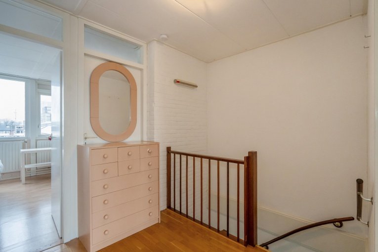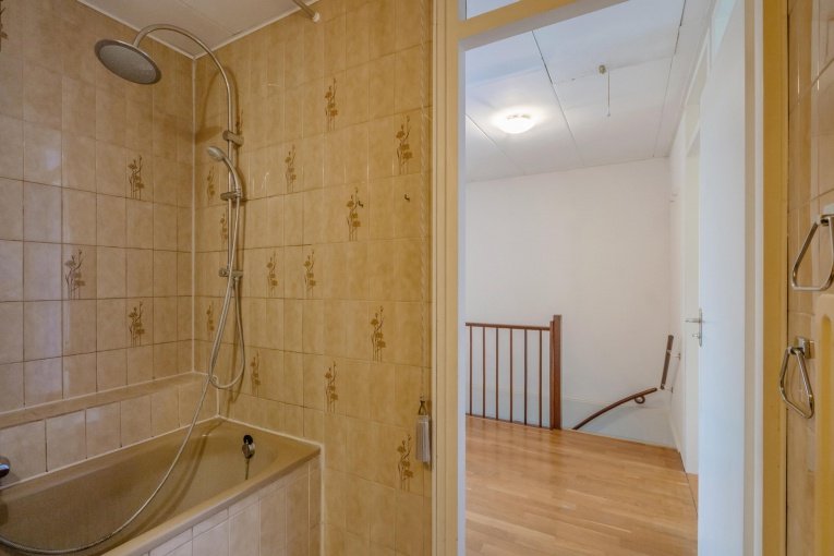 Overloop, 3 slaapkamers (mogelijkheid tot 4 zoals oorspronkelijk), badkamer met ligbad met douche, vaste wastafel en 2e toilet.