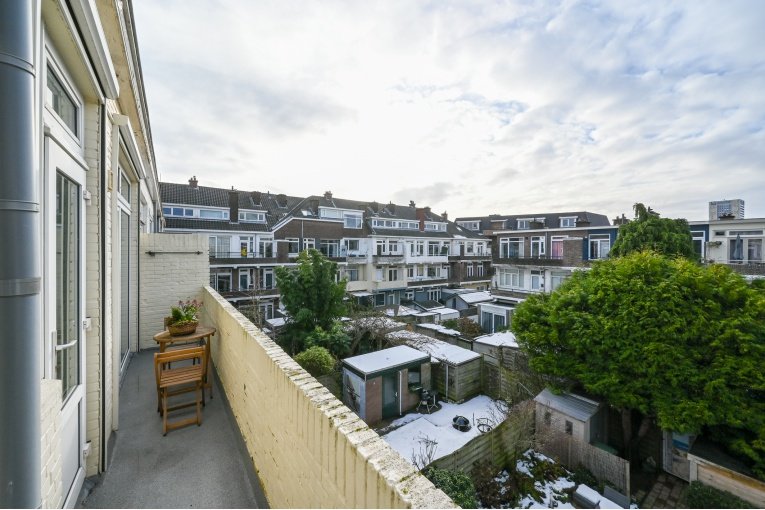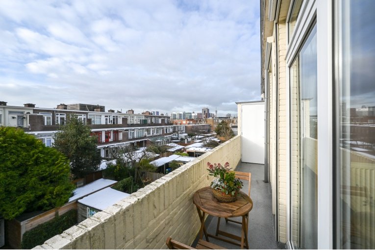 Het balkon (ZW) ligt over de gehele breedte van de woning en is bereikbaar vanuit de keuken en de achterslaapkamer.