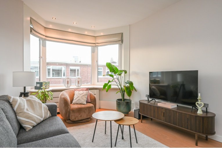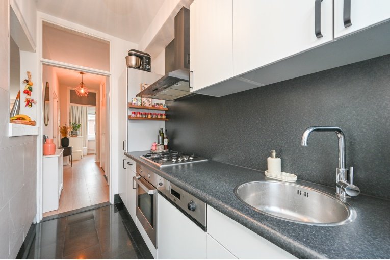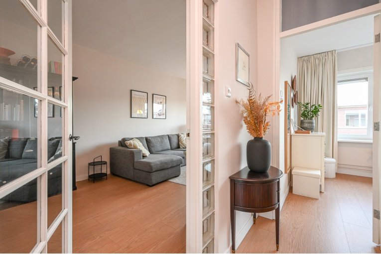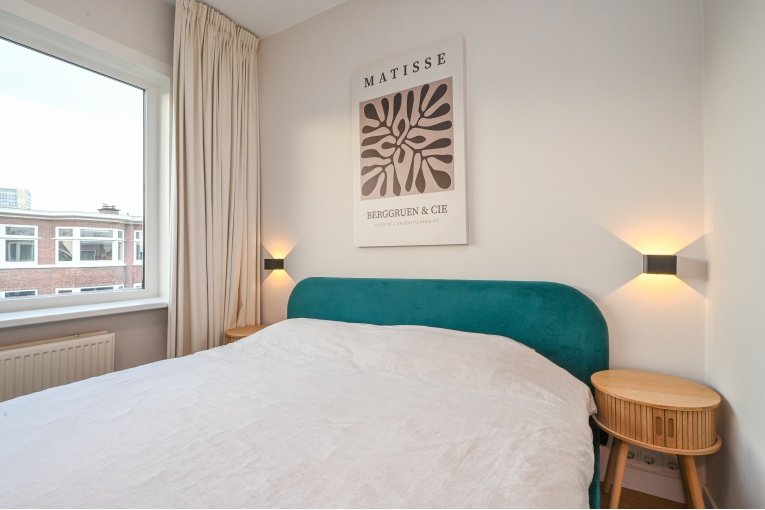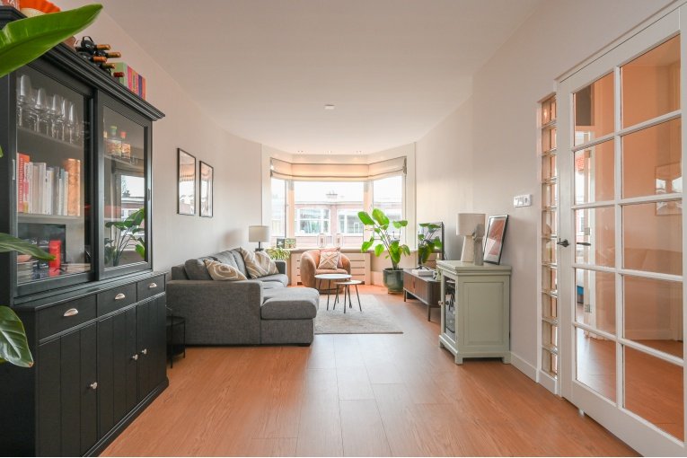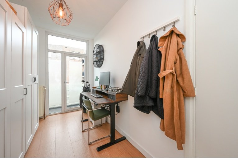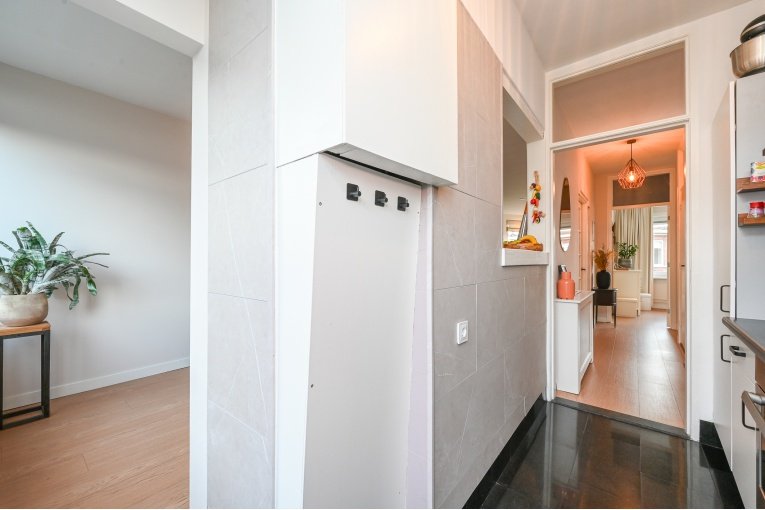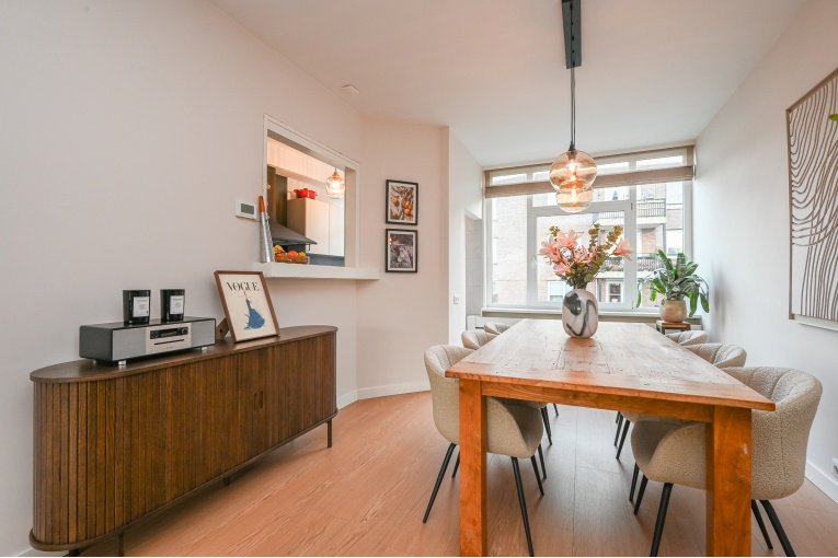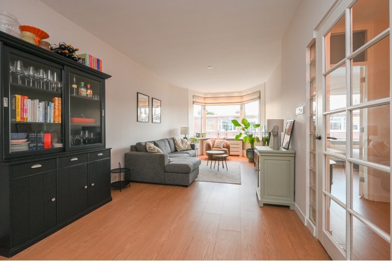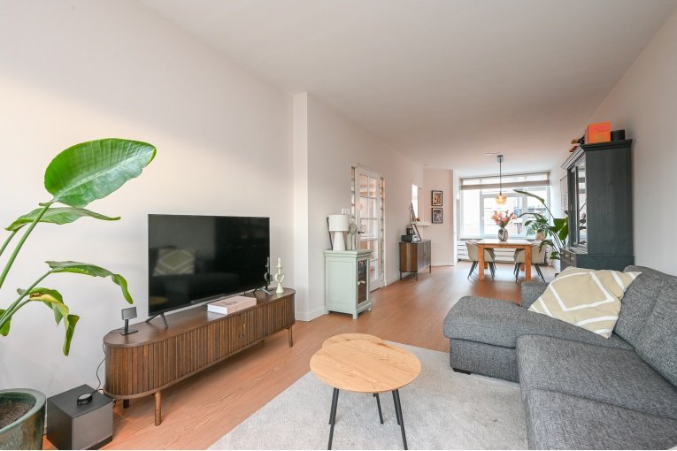 Overloop. Ruime en lichte (voormalig en suite) woon-/eetkamer met toegang tot het balkon. Nette semi open keuken met diverse inbouw apparatuur (gaskookplaat, oven, afzuigkap, koelkast, vries en vaatwasser) en opstelplaats van de recente CV -ketel Remeha 2024. Badkamer met douche, wastafelmeubel, designradiator en de wasmachine/- droger aansluiting. Modern vrijdragend toilet met fonteintje. Ruime slaapkamer aan de voorzijde en een goede 2e slaapkamer aan de achterzijde.