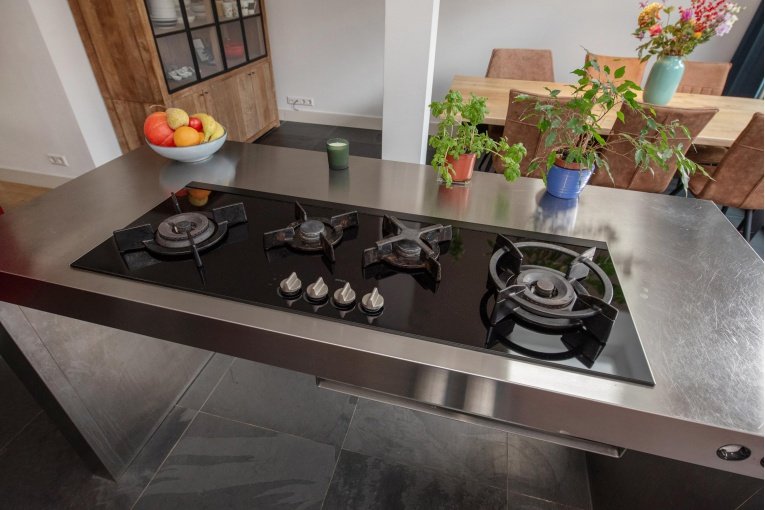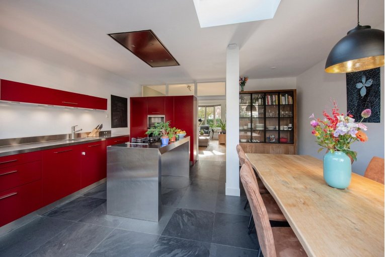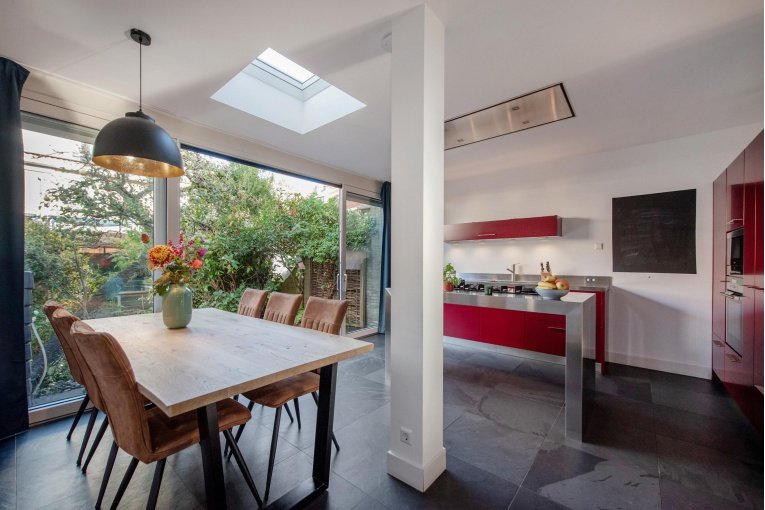 De gang, het toilet en de woonkeuken zijn voorzien van een leistenen vloer met vloerverwarming. De uitbouw beschikt over een elektrisch bedienbare lichtkoepel.