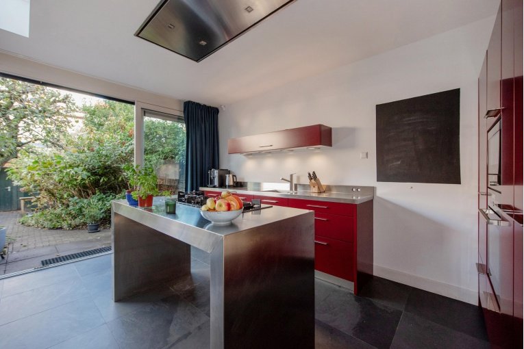 Voortuin. Entree. Hal met modern vrijdragend toilet met fontein, kelderkast en bergkast voorzien van wasmachine- en droger aansluiting. Woonkamer met massief houten vloer en fraaie halfronde erker. Ruime uitbouw aan de achterzijde met gezellige woonkeuken, welke is voorzien van een luxe Italiaanse keuken met roestvrijstalen kookeiland, hoogwaardige inbouwapparatuur (gaskookplaat, afzuigkap, magnetron, oven, koelkast, vriezer, vaatwasser en close-in boiler). Vanuit de woonkeuken middels grote schuifpui toegang tot de zonnige achtertuin op het noordoosten met schuur en achteringang.