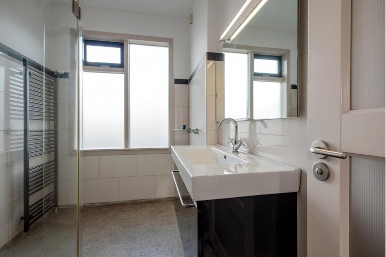 Overloop. Eenvoudig modern toilet. Ruime voorslaapkamer (voorzij- en voorslaapkamer zijn samengevoegd). Achterslaapkamer. Moderne badkamer met inloopdouche en wastafel met meubel.