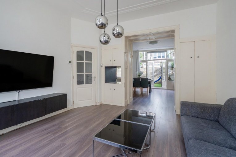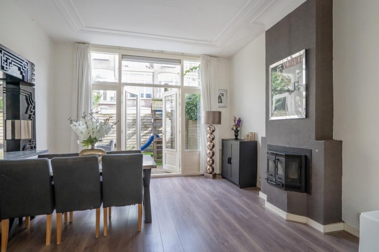 De sfeervolle woonkamer en suite vormt het hart van de woning en wordt gekenmerkt door klassieke details zoals hoge plafonds en vaste kasten. De eetkamer aan de achterzijde staat in directe verbinding met de tuin middels openslaande deuren, waardoor binnen en buiten in elkaar overlopen.