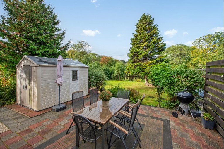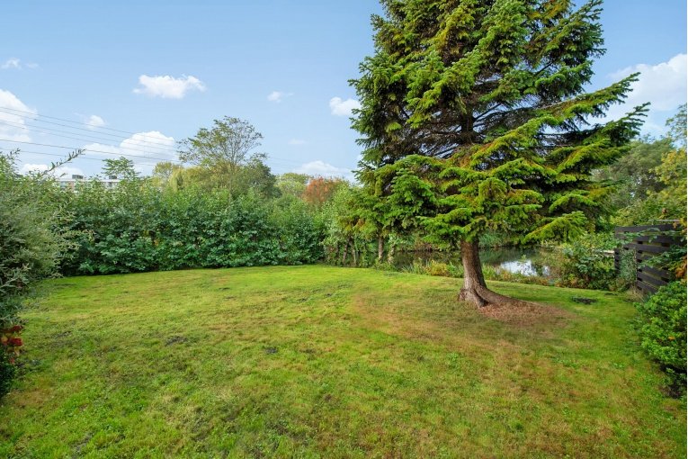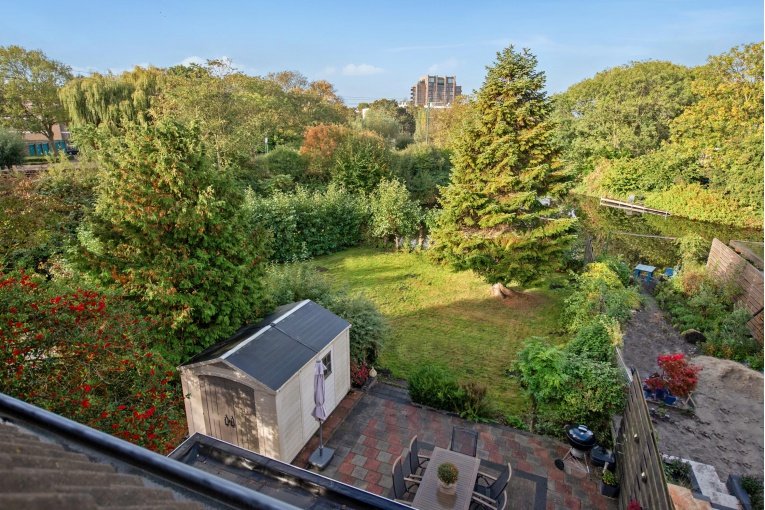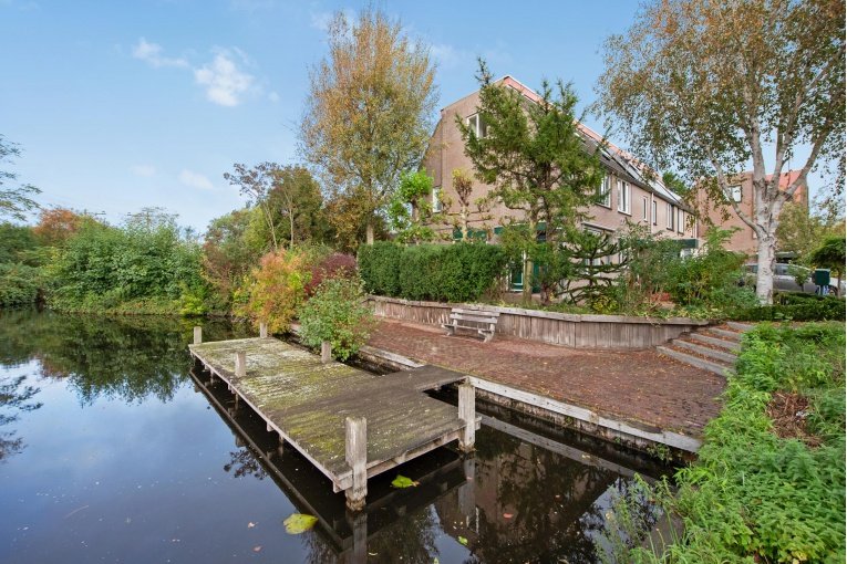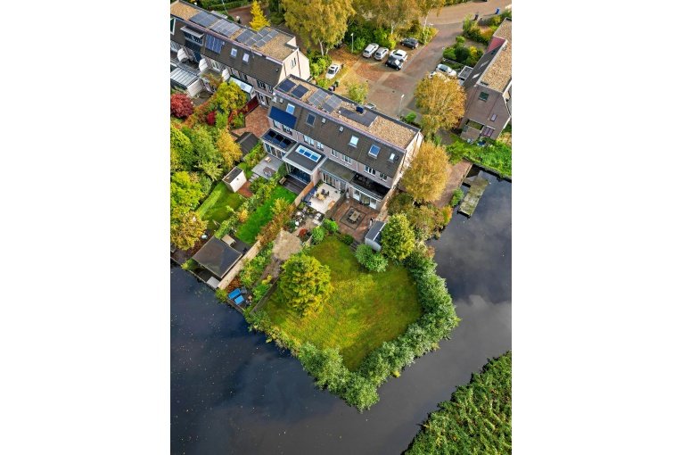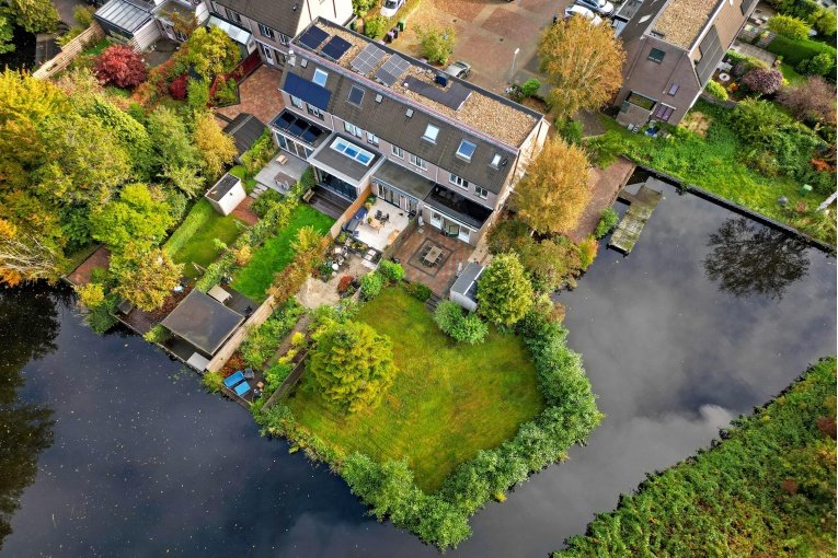- Voortuin- en achtertuin van totaal ca. 630 m², gelegen aan het water;