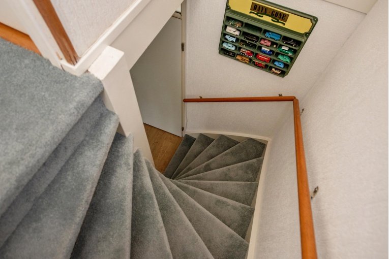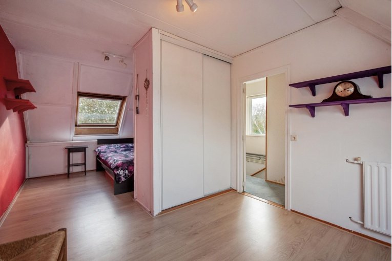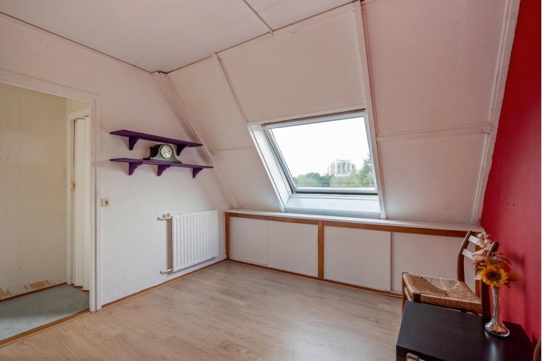 Ruime zolderkamer (eenvoudig 2 kamers te creëren) met grote dakramen, kleine bergkamer.