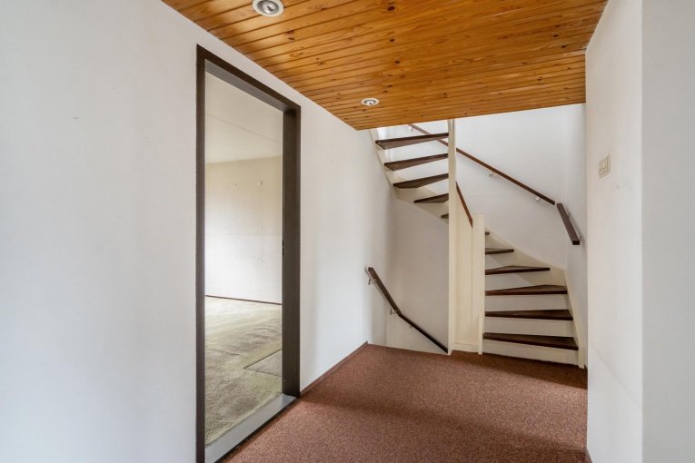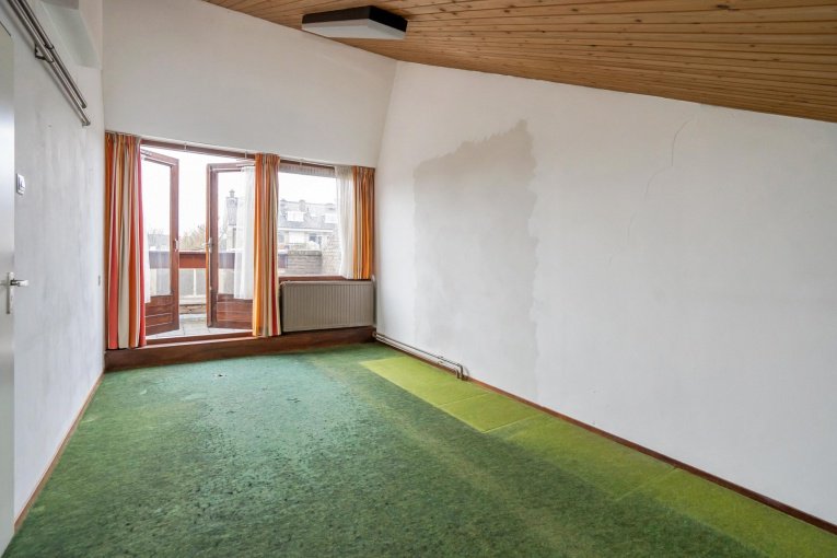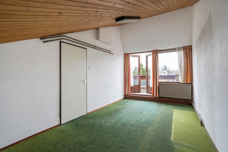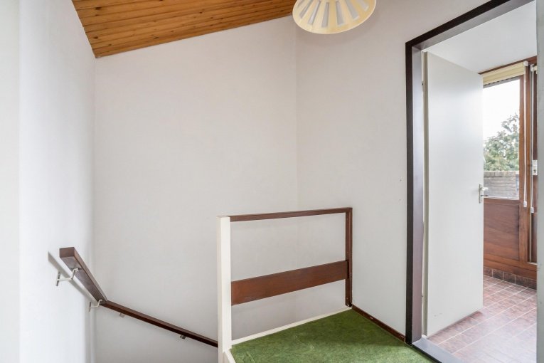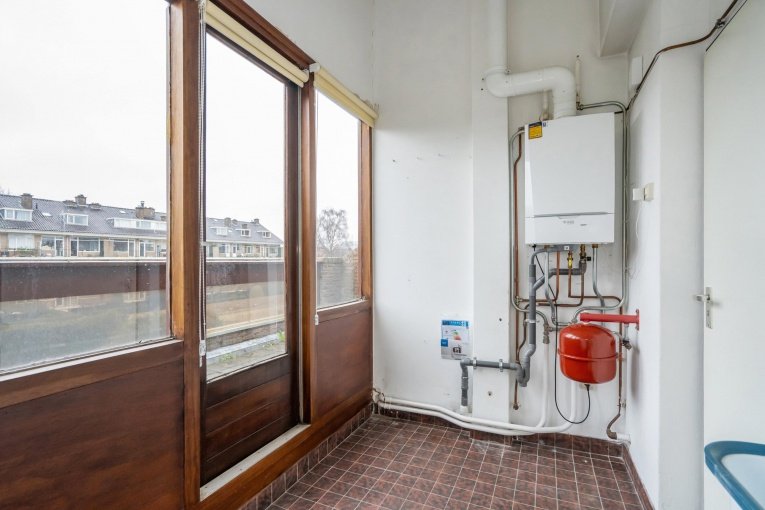 Vaste trap naar de 2e verdieping. Overloop en ruime berging. Was/stookkamer met wasmachineaansluiting, wastafel en opstelplaats C.V.-ketel en toegang tot het zonnige dakterras (ZW). Ruime slaapkamer.